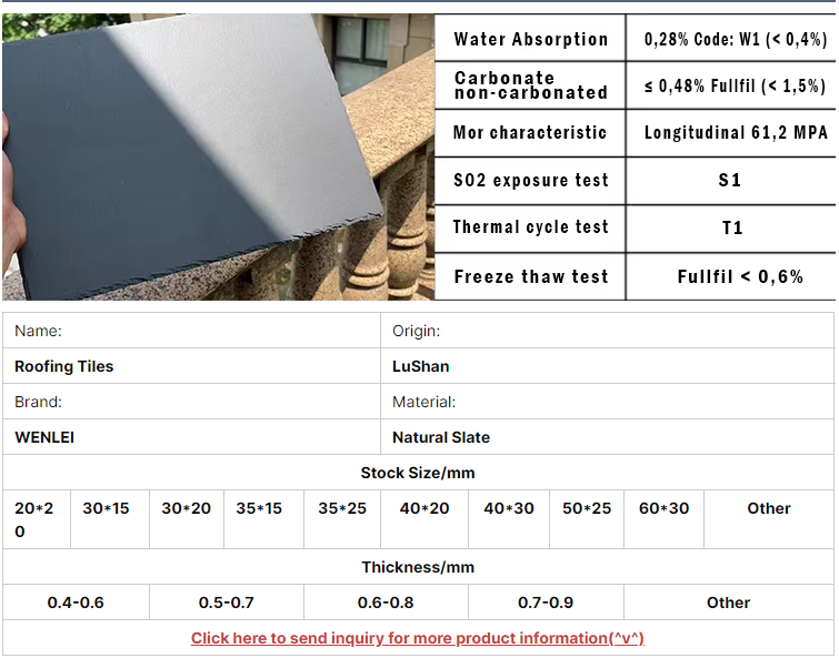 Outstanding natural slate ——Roof Slates Black slate roof tiles are made of natural stone that is quarried from slate deposits. Outstanding longevity – WENLEI slate has a natural life expectancy of over 100 years. This is far longer than other roofing materials such as cement, concrete, Jiangxi Building Stones Material Black Slate Square Roofing Tiles